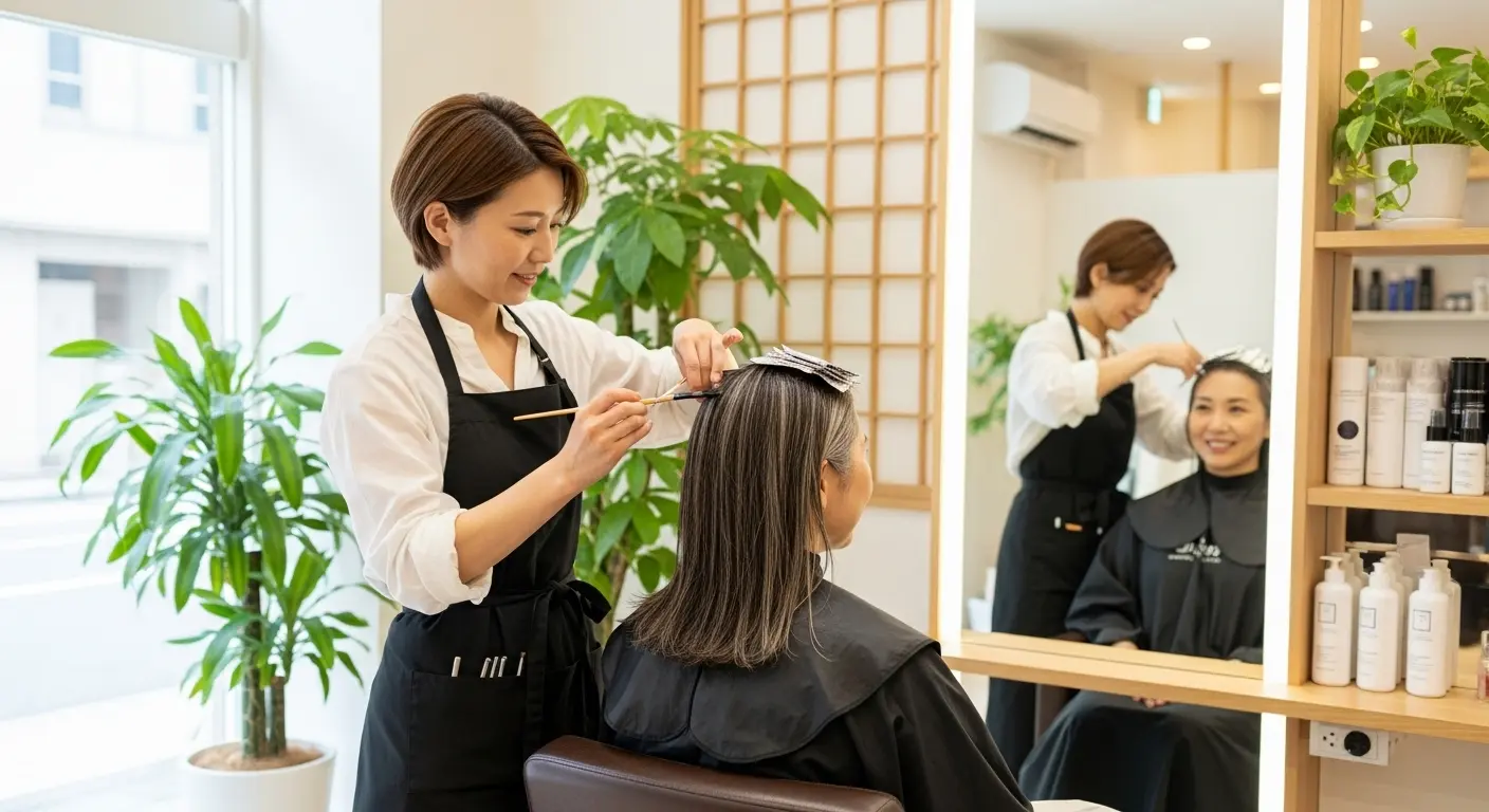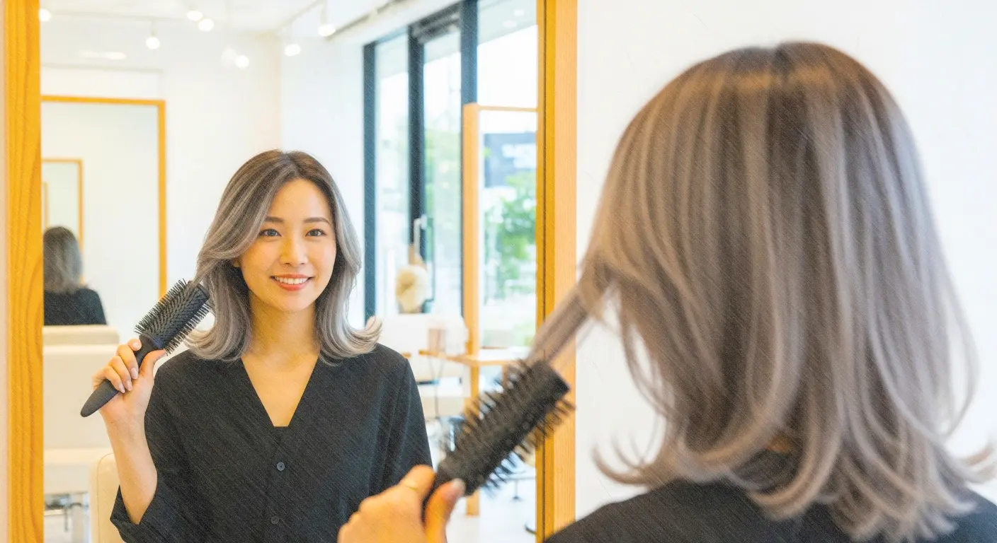 一方で、ブリーチ使用のため髪負担は大きく、白髪自体は染めず周囲になじませるため残ります。ダメージでパーマ・縮毛矯正が困難になる可能性や、色落ちが早く、施術時間が長く、髪全体が明るい印象になりやすいです。工程は、ブリーチでハイライトを入れコントラストを和らげ、その後ファッションカラーで染め馴染ませます。アッシュやグレージュなどがおしゃれで人気です。