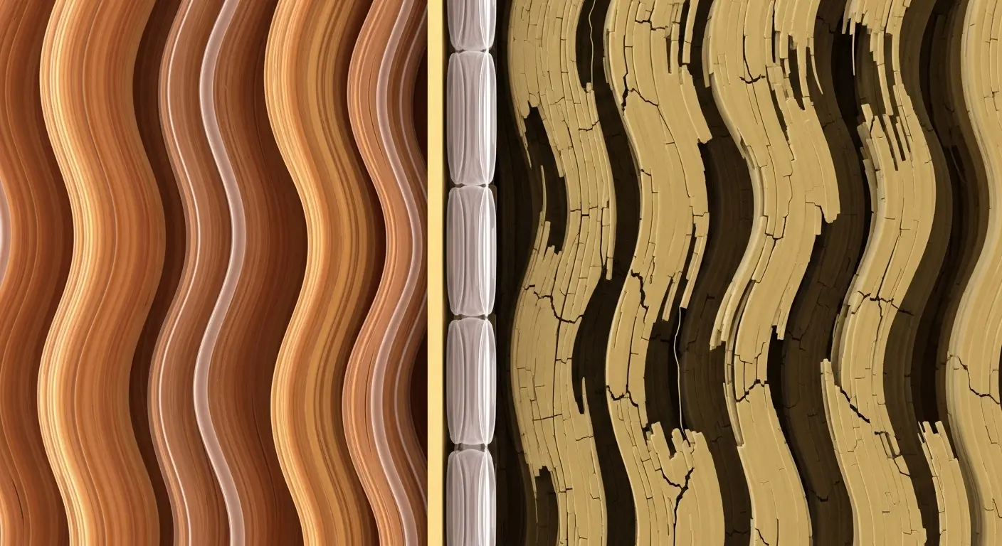 ケラチンタンパク質の構造が変化することで、髪を保護するキューティクル層が破壊され、髪の内部に微細な空洞(多孔性)が増加してしまいます。さらに、髪の内部構造の中でも特に重要な細胞膜複合体(CMC)が破壊されると、髪の中からタンパク質が流出してしまう「プロテインリーク」という現象を引き起こします。