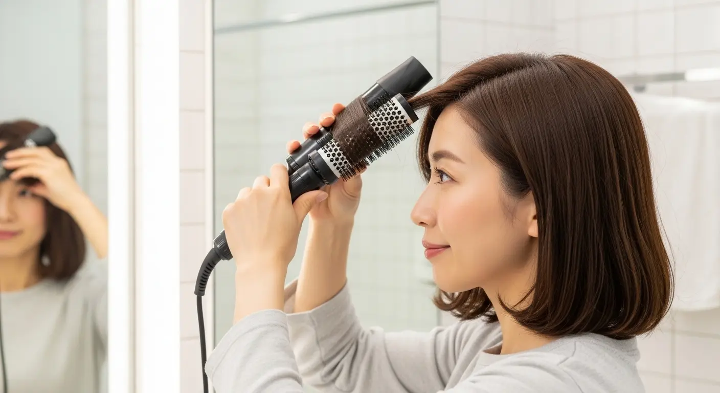 「外ハネ」の作り方は、基本的に内巻きの逆の動作です。太ロールブラシやワイドブローブラシを使い、毛先を巻き込む際に、手首を内側ではなく「外側(後ろ方向)」に回転させます。肩にあたってハネやすいボブやミディアムヘアの方は、このテクニックを使うと、ハネを「活かした」おしゃれなスタイルに仕上がります。特に襟足の部分をキュッと外ハネにすると、首元がすっきりとして見えます。