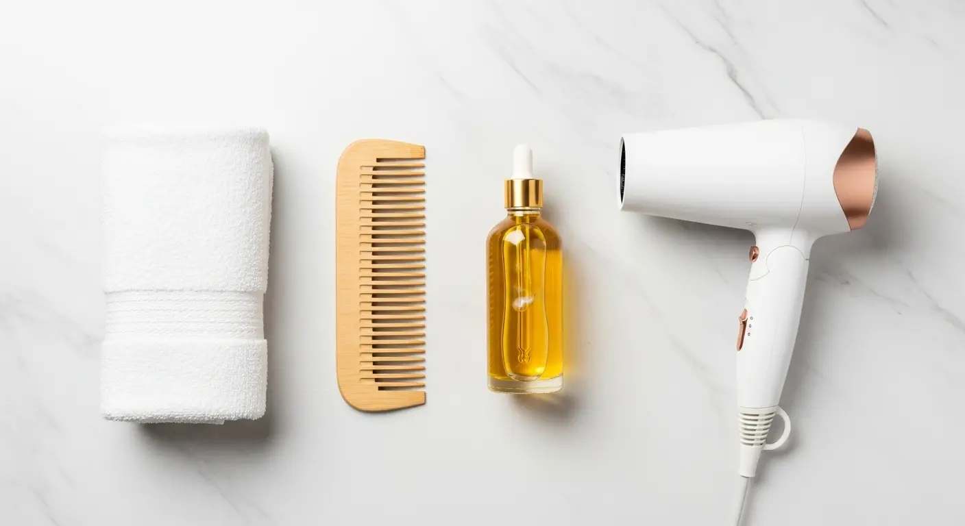 洗い流さないトリートメントやヘアオイルを適量手に取り、手のひらでよく伸ばしてから、髪の中間から毛先にかけて重点的になじませます。これは、ドライヤーの熱から髪を守るための必須の工程です。