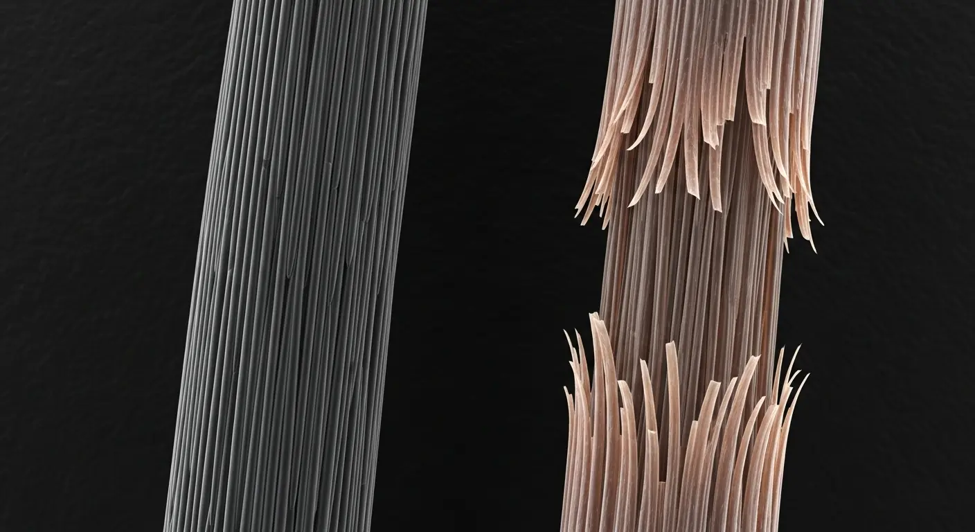 ドライヤーの風で髪が絡まる最大の物理的な原因は、髪の表面を覆う「キューティクル」の損傷にあります。キューティクルは、うろこ状に何層にも重なって髪の内部を守る鎧のような存在です。健康な髪では、このうろこが綺麗に整然と閉じているため、髪同士が触れ合っても滑らかにすり抜け、美しいツヤが生まれます。