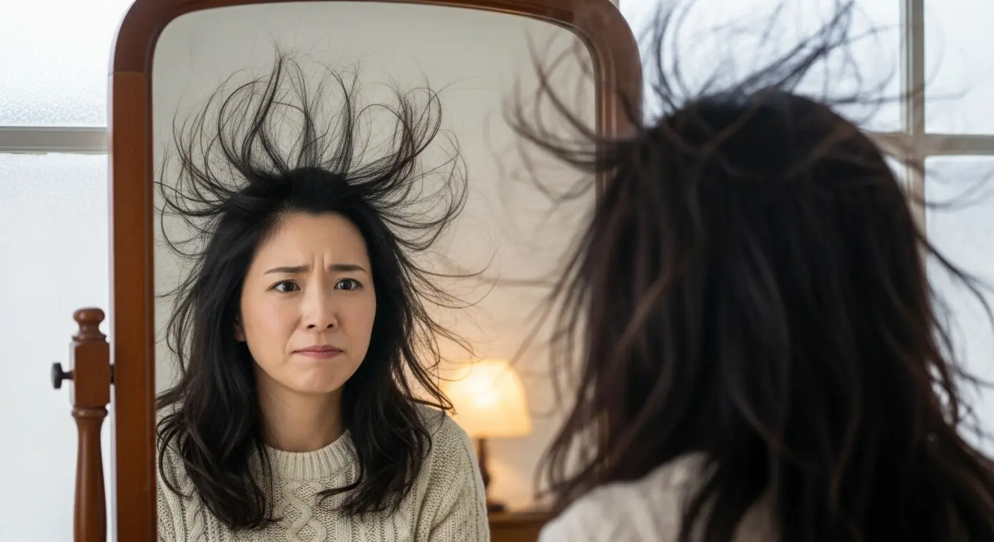 冬場やエアコンの効いた部屋で、髪がパチパチと音を立てて広がったり、顔にまとわりついたりした経験は誰にでもあるでしょう。この「静電気」も、髪が絡まる非常に厄介な原因の一つです。