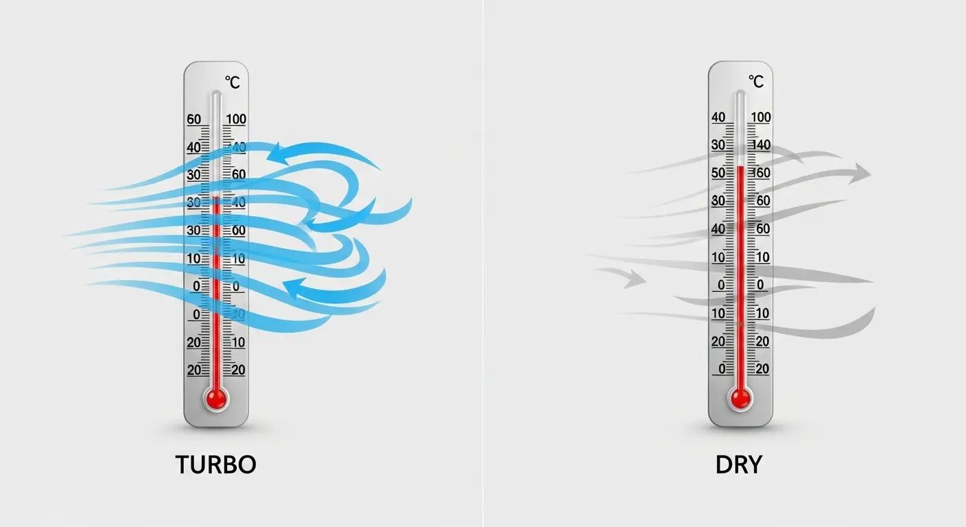 - Turboモードの温度がDRYモードより低いのは、強風で熱が分散されるためである