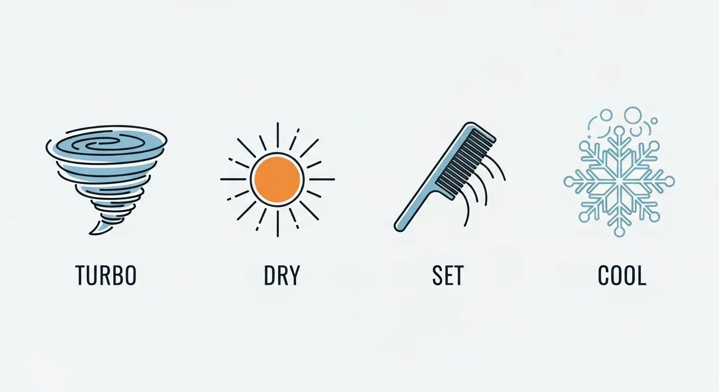 ドライヤーの性能を最大限に引き出すには、Turboモード以外の各モードの役割を正しく理解し、使い分けることが不可欠です。一般的なドライヤーに搭載されている主要な4つのモードについて、その目的と機能の違いを明確に整理してみましょう。