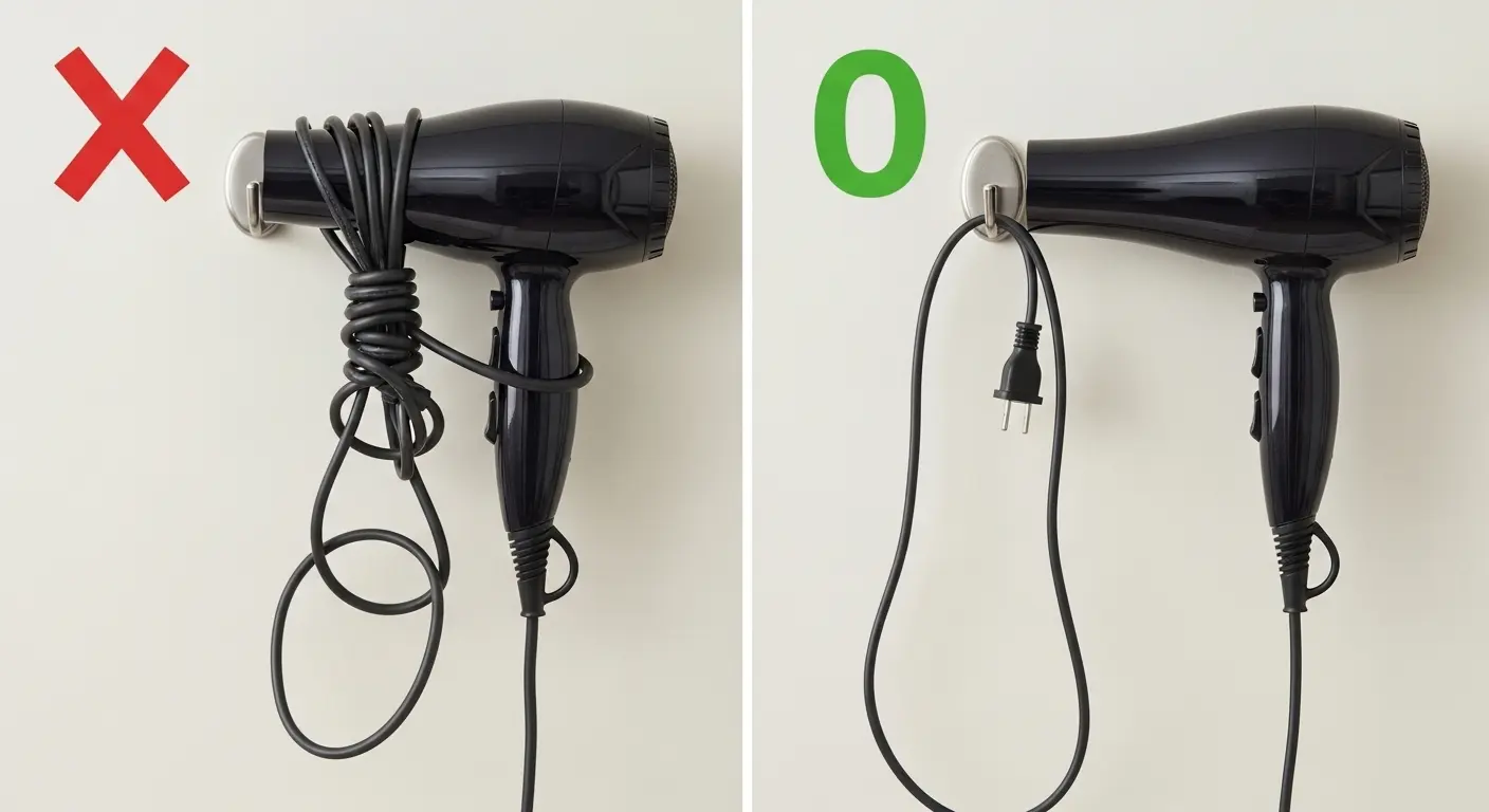 コードを本体に巻き付けると、最も負担がかかるコードの付け根部分が毎回鋭角に折り曲げられ、ねじれが加わります。これを繰り返すことで内部の電線が徐々に疲労し、断線してしまうのです。洗面台のスペース確保のためにやりがちなこの収納方法は、ドライヤーの寿命を著しく縮め、火災のリスクを高める最も危険な行為です。コードは必ず、付け根に負担がかからないように