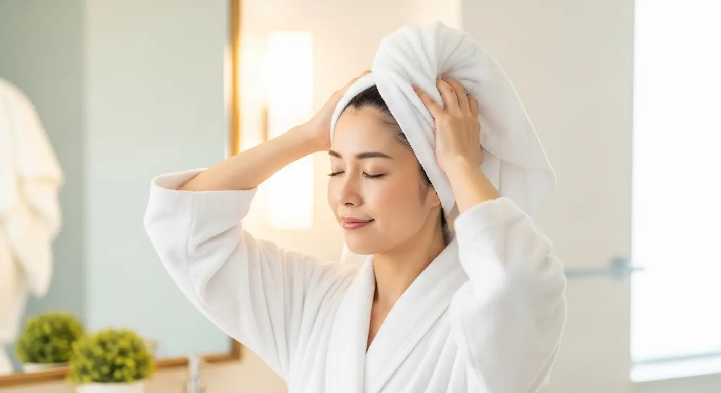 - 押さえる(地肌):タオルを頭にかぶせ、指の腹で頭皮全体を優しくマッサージするように押さえ、根元の水分を吸い取る。(最重要)