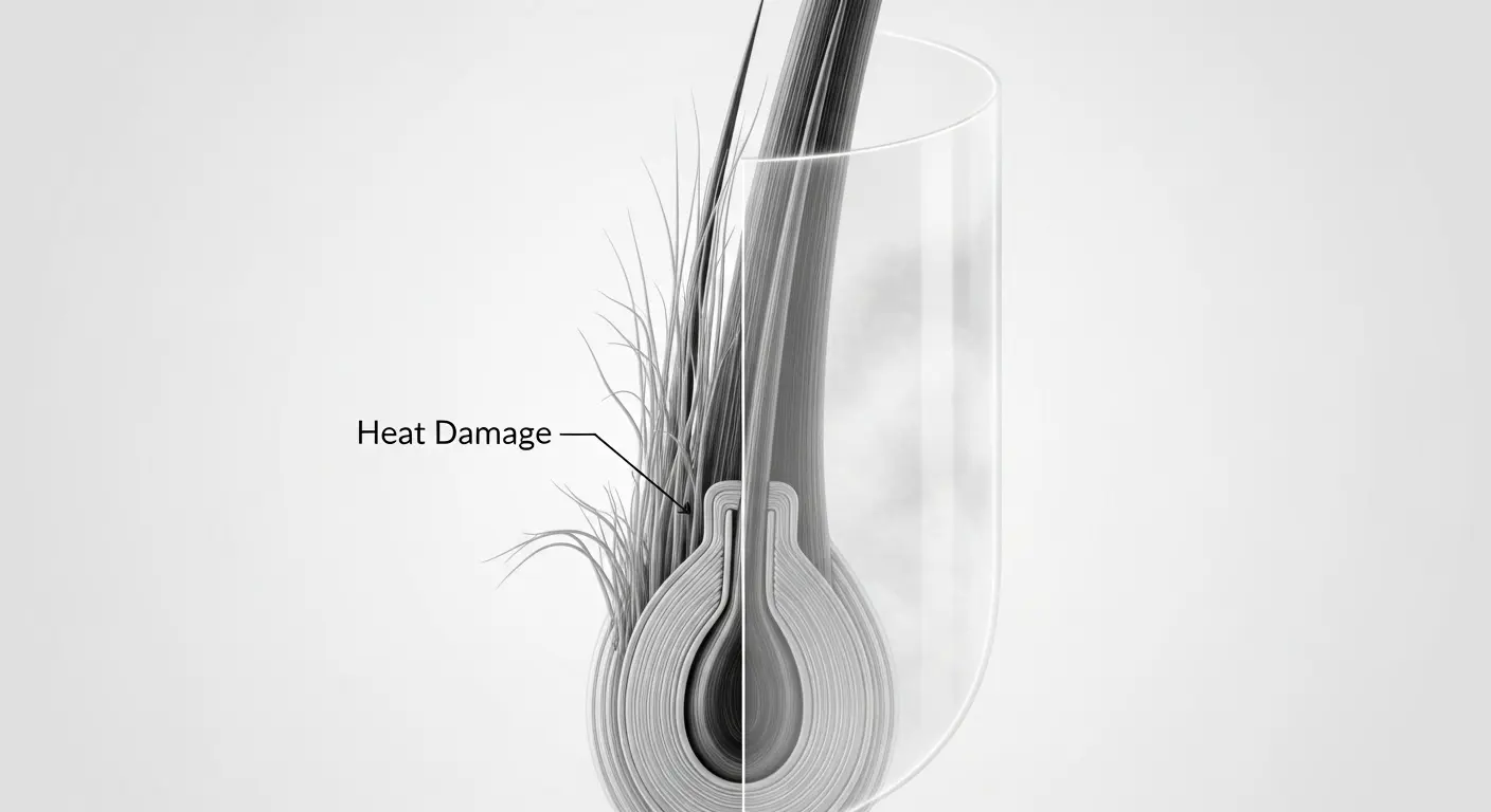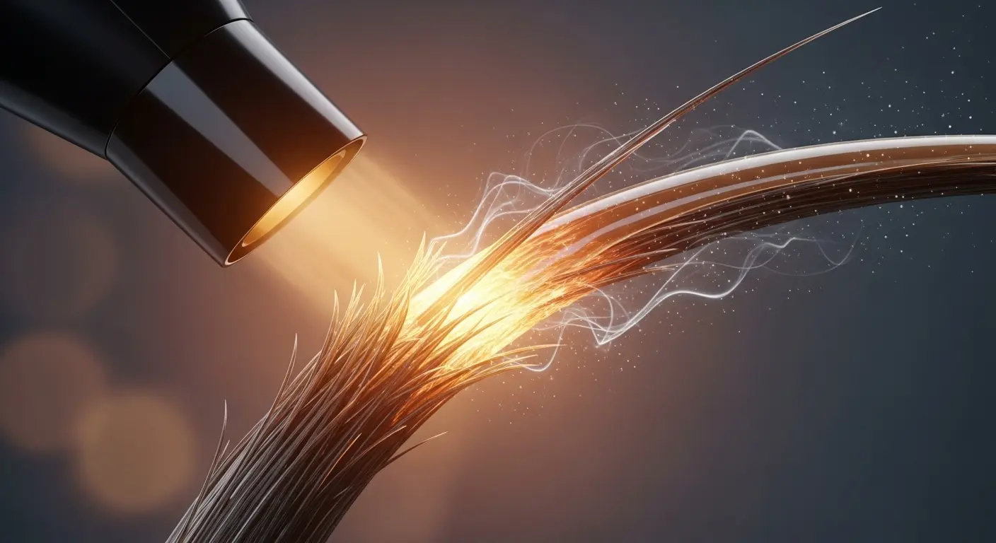 髪の毛は主にタンパク質でできています。このタンパク質は熱に弱く、濡れた髪に高温のドライヤーを当て続けると、髪内部のタンパク質が構造変化を起こし、ダメージホールと呼ばれる空洞ができてしまいます。これが、髪が硬くなったり、パサついたりする「熱ダメージ」の正体です。