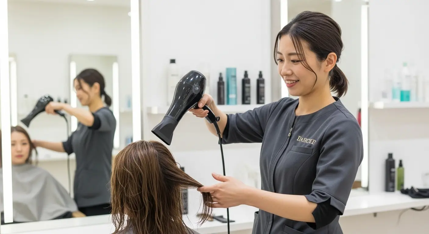 ここがプロと素人の分かれ道です。温風で100%乾かしきることは、「オーバードライ(乾かしすぎ)」と言い、髪内部の必要な水分まで奪ってしまいます。髪全体が「8割〜9割乾いたな」という、少ししっとり感が残る状態で温風を止めます。