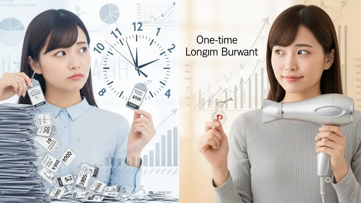 先ほどの試算通り、サロンで髪質改善トリートメントを継続すると年間12万円以上のコストがかかります。これに対し、最新のフラッグシップモデルのドライヤーを5万円で購入したとします。ドライヤーの寿命は使用頻度にもよりますが、一般的に3〜5年と言われています。仮に3年(1095日)使うとすれば、本体価格5万円 ÷ 1095日 = 1日あたり約45円です。電気代を含めても微々たるものです。
