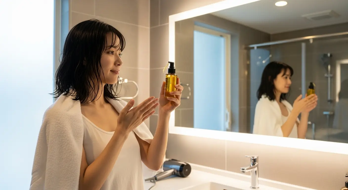これが最も重要なステップです。ドライヤーの熱から髪を守るため、洗い流さないトリートメント(アウトバストリートメント)を必ず塗布します。ヘアオイルやエマルジョン(乳液タイプ)などを手のひらに適量広げ、毛先を中心にもみ込むようになじませます。これは、髪表面のキューティクルを保護し、ドライヤーの熱ダメージから髪を守る「盾」の役割を果たします。
