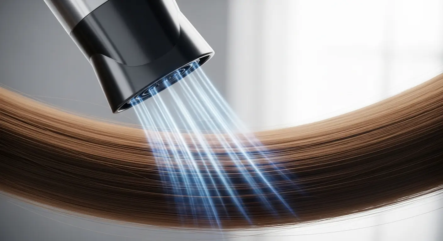 ここからが最も重要なポイントです。髪がほぼ乾いたら、ドライヤーのモードを必ず「冷風(クールモード)」に切り替えてください。そして、髪全体に冷風を当てて、髪に残った余熱を完全に取り去ります。