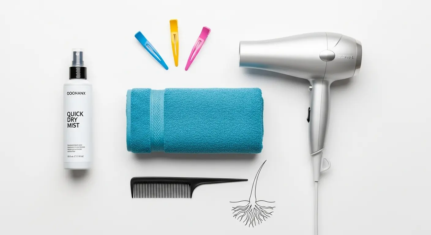 洗い流さないトリートメントやヘアオイル、速乾性を謳った「クイックブローミスト」などをドライヤー前に使用します。これらの製品は、髪を熱から守るだけでなく、髪表面の水分をコーティングして蒸発を促進する効果があり、ドライ時間を短縮してくれます。