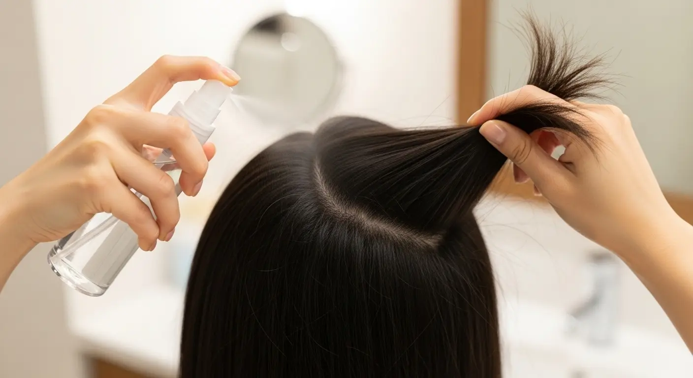 最も効果的で効率的な方法は、霧吹き(スプレーボトル)を使って、寝癖がついている部分の根元をピンポイントで濡らすことです。髪全体をびしょ濡れにする必要は全くありません。根元の地肌に水分が届くように、髪をかき分けながらシュッとスプレーしましょう。水分が髪の内部に浸透し、水素結合が切れるまで少し時間を置くと、より効果的です。