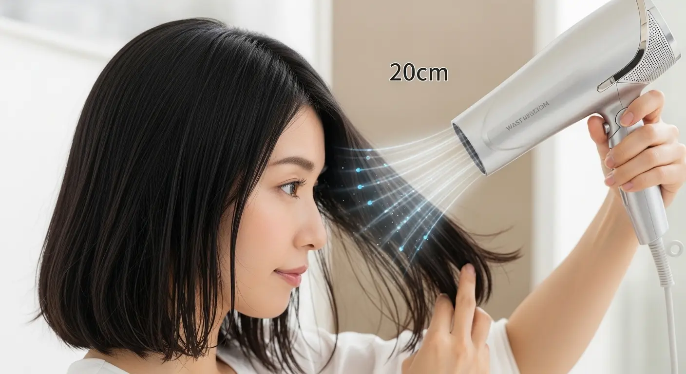まず基本は、髪からの距離と風を当てる向きです。ドライヤーは髪から15~20cmほど離して使いましょう。近づけすぎは熱ダメージの元です。そして、必ず髪の根元から毛先に向かって風を当ててください。これはキューティクルが根元から毛先に向かってウロコのように重なっているためで、流れに沿って乾かすことでキューティクルが自然に閉じて整いやすくなります。
