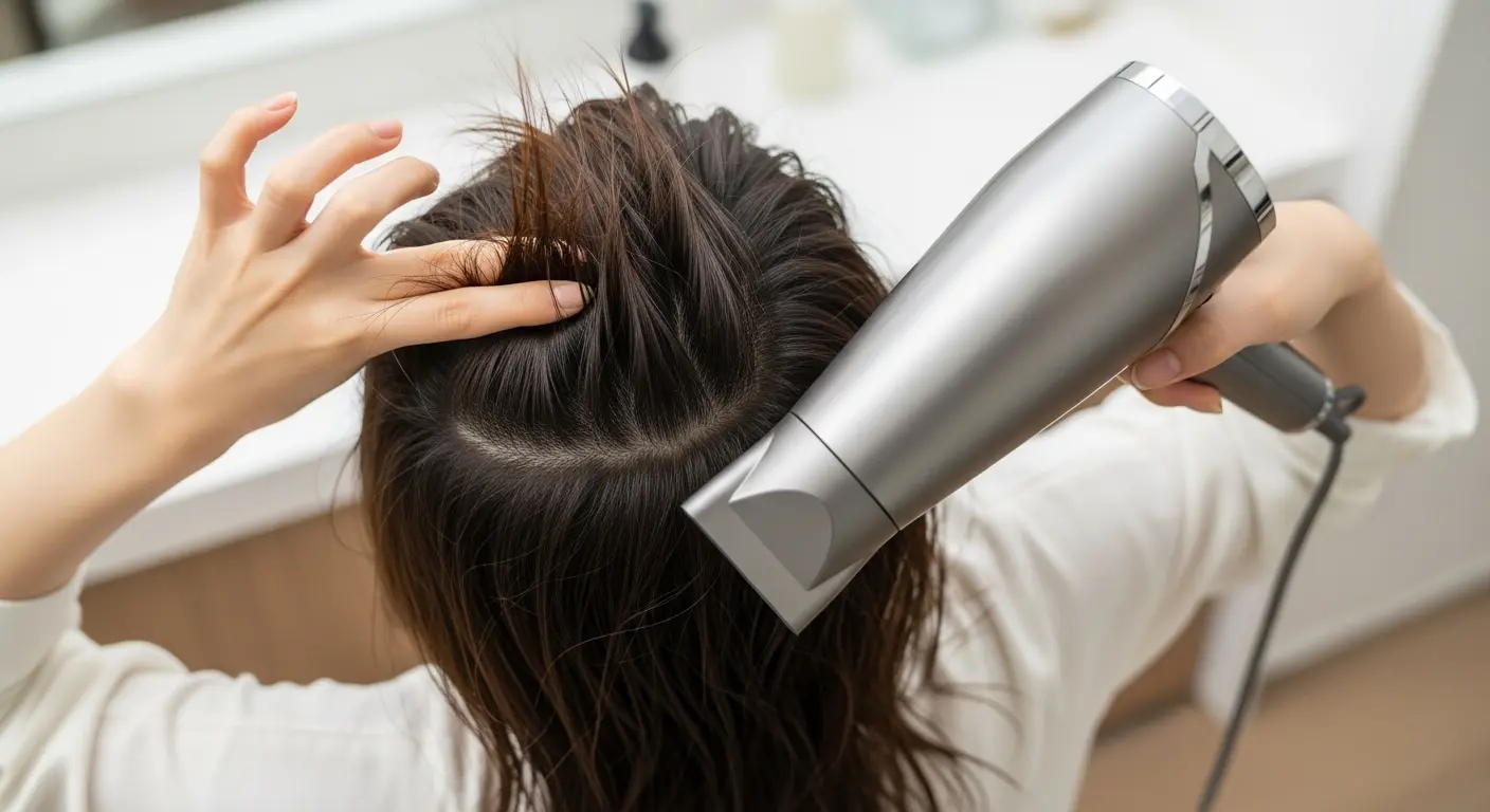 - 根元を最優先で乾かす(速乾力):ドライヤーの「温風・最大風量」を使用し、髪の根元(頭皮)から乾かし始めます。根元が生乾きだと、そこから湿気を吸い込みうねりの原因になるため、手で髪を掻き分けながら頭皮を重点的に乾燥させます。