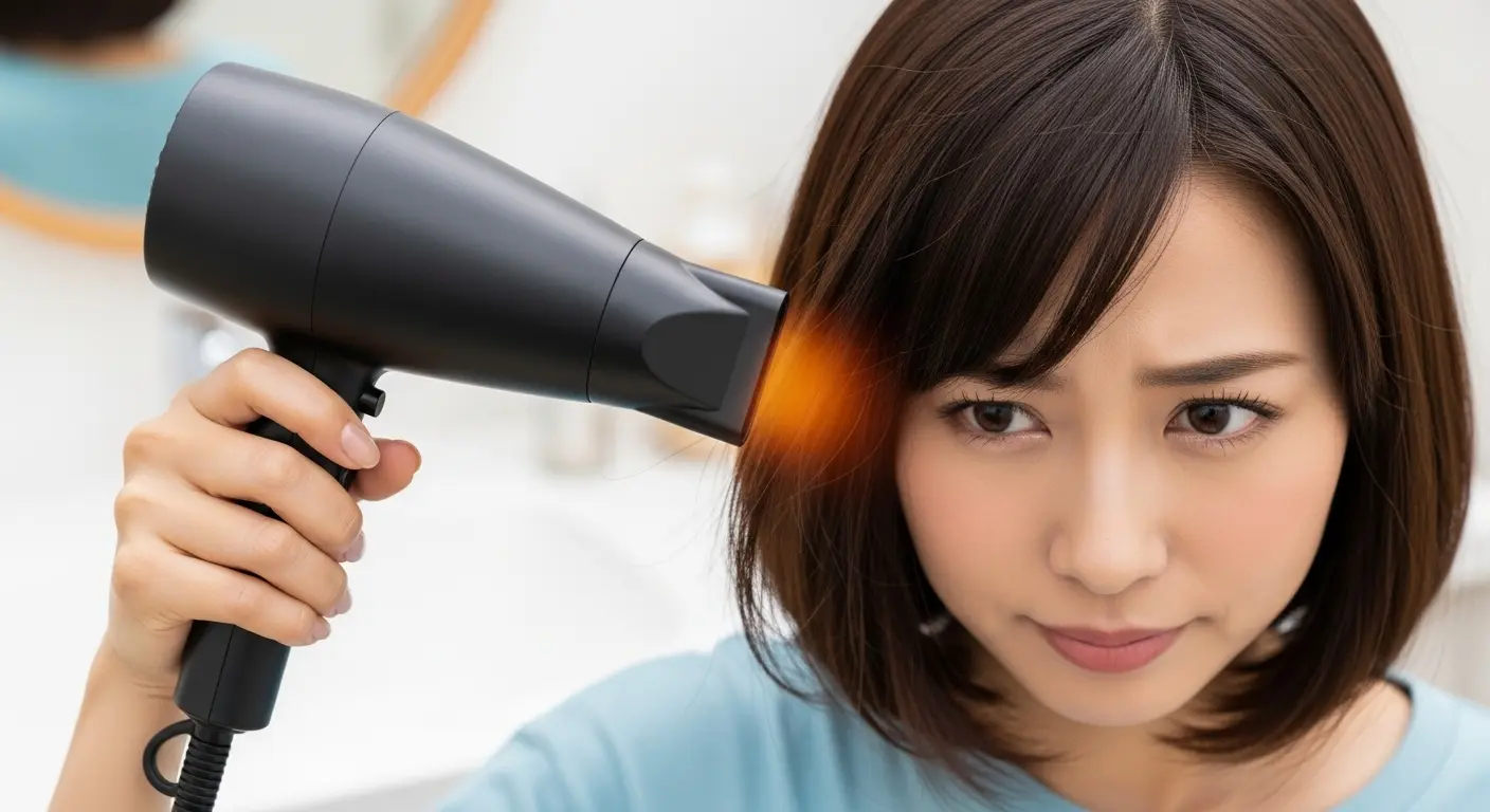 一点に集中して高温を当て続けると、髪のタンパク質が熱変性を起こし、深刻な熱ダメージにつながります。髪は熱に弱く、一度変性すると修復は困難です。ドライヤーは常に振りながら、風を分散させ、髪の表面温度が上がりすぎないように注意が必要です。